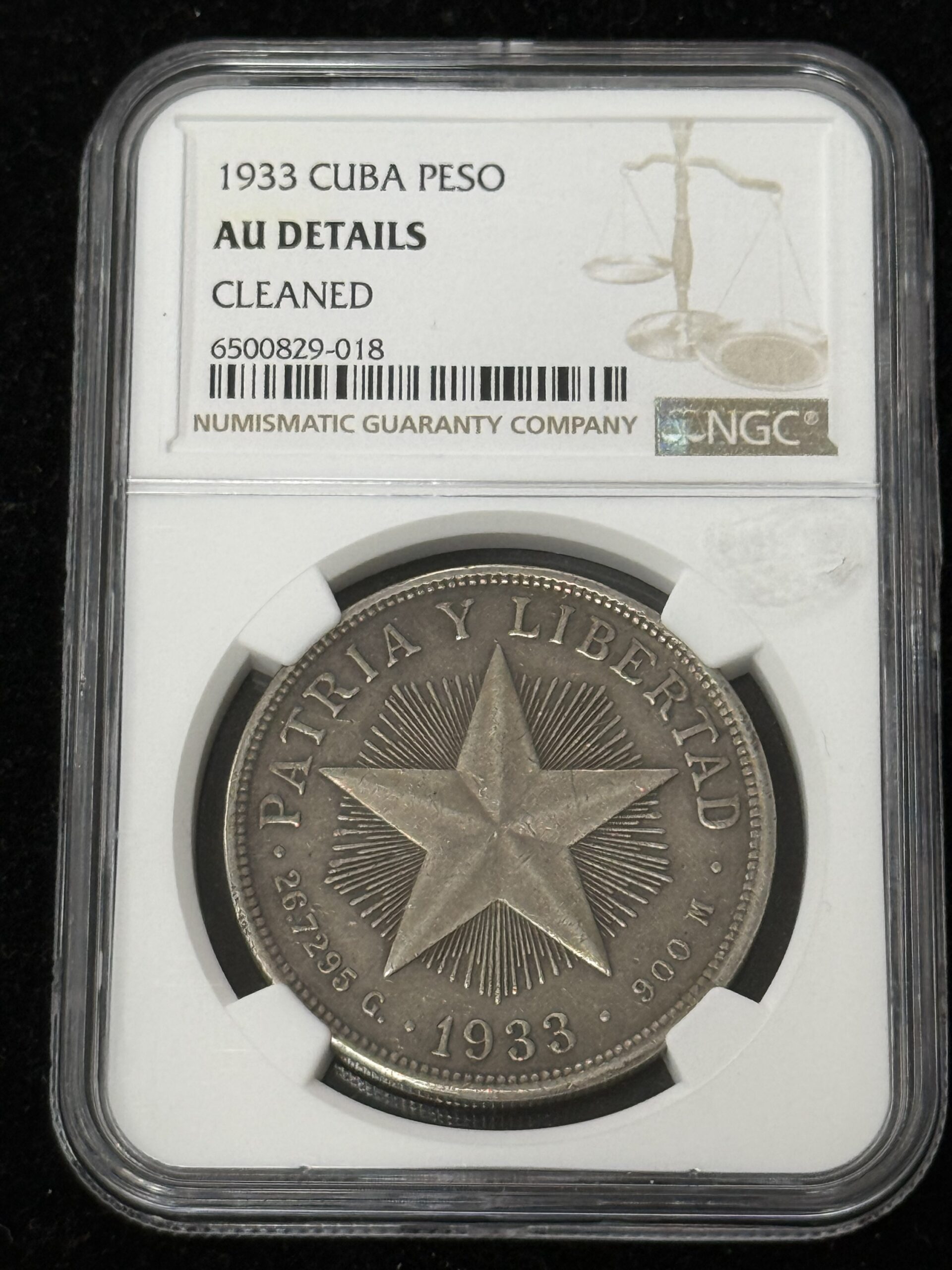 1933 Cuba Silver Star Peso NGC NGC AU Cleaned