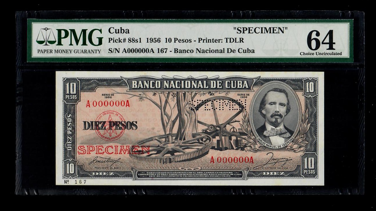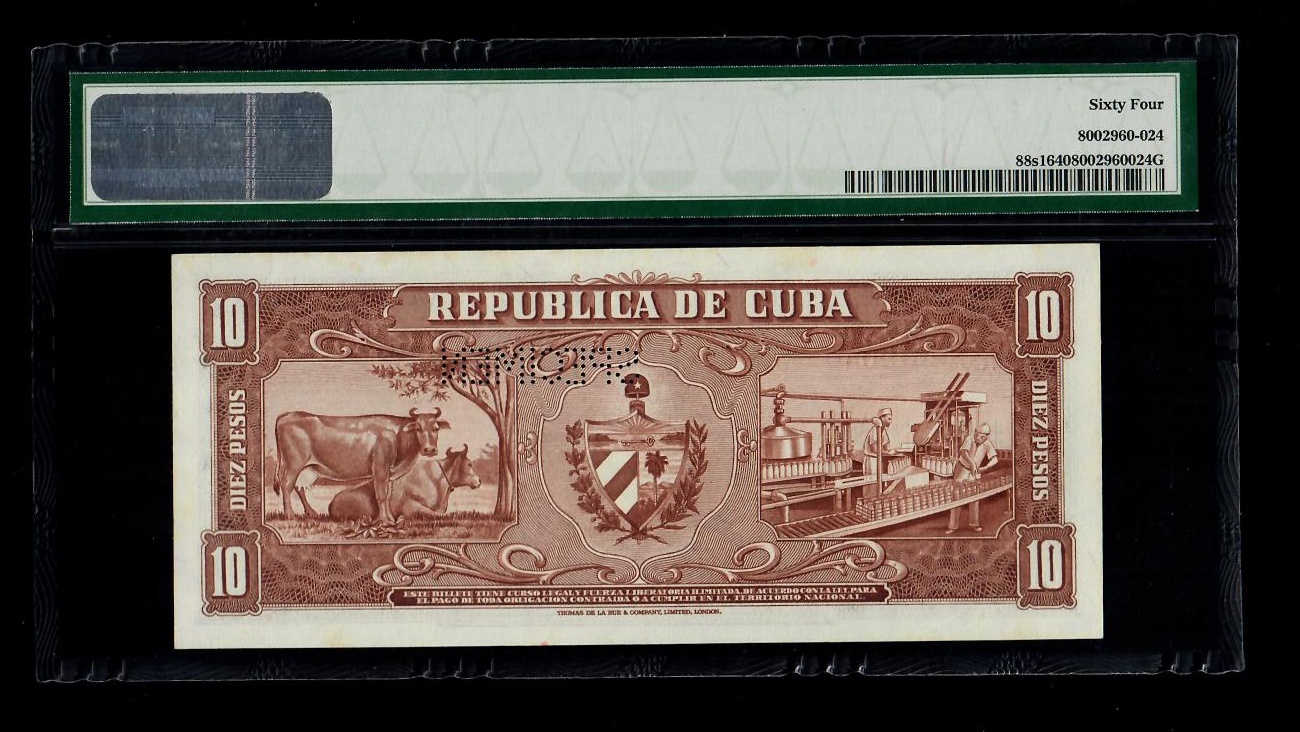 1956 Banco Nacional Cuba 10 Pesos Specimen PMG 64